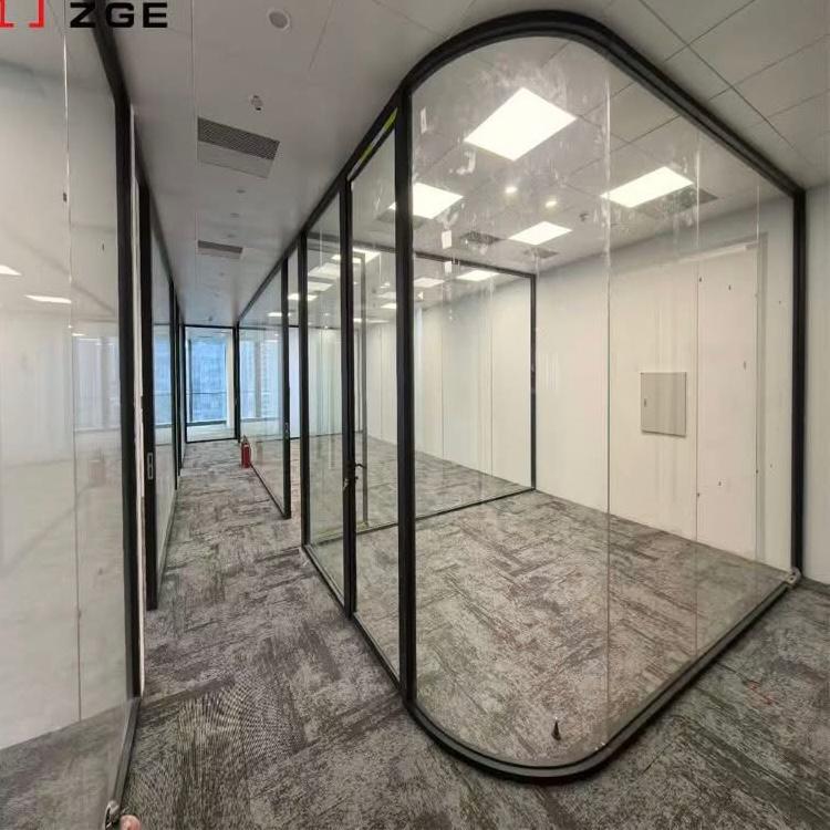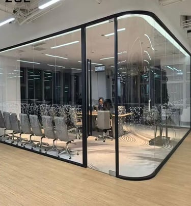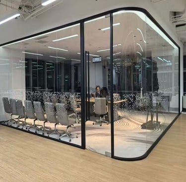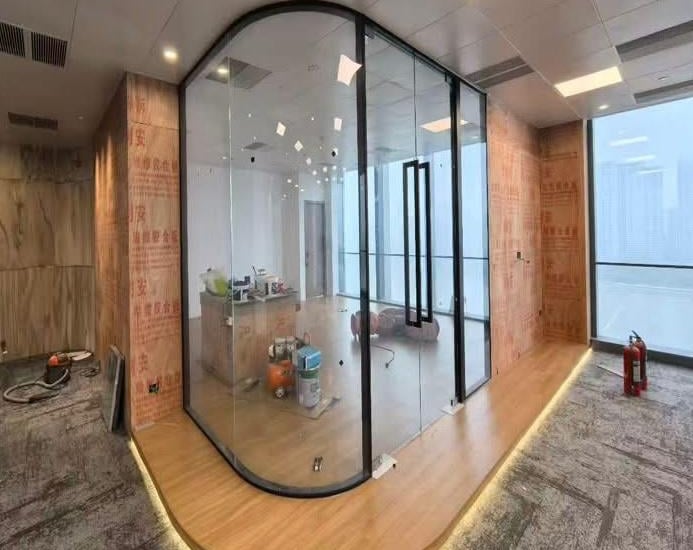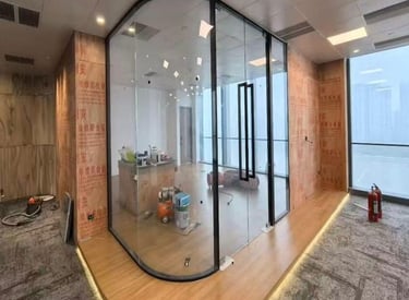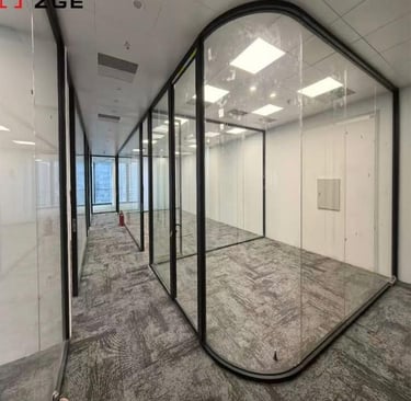 Glass partitions creating open, bright work areas.